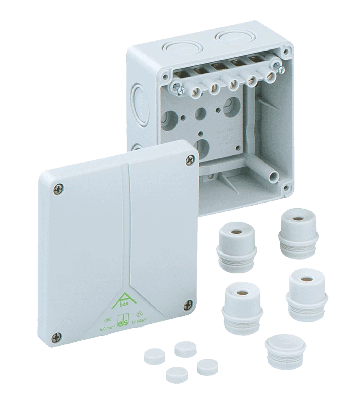 Abzweigkasten grau IP 65, mit hochliegender Schraubklemme 5-polig – 6 mm² (4 x 2,5 / 4 x 4 / 3 x 6 mm²) mit IP 54 Anbaustutzen und Verschlussstopfen M25, Dichtbereich 9- 18,5 mm