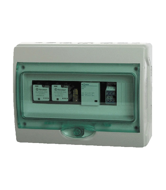 Automatische Umschalteinheit für 3 Eingänge Strombelastbarkeit: Land + Wechselrichter max. 16 A, Generator max. 25A (6kW). IP X4.