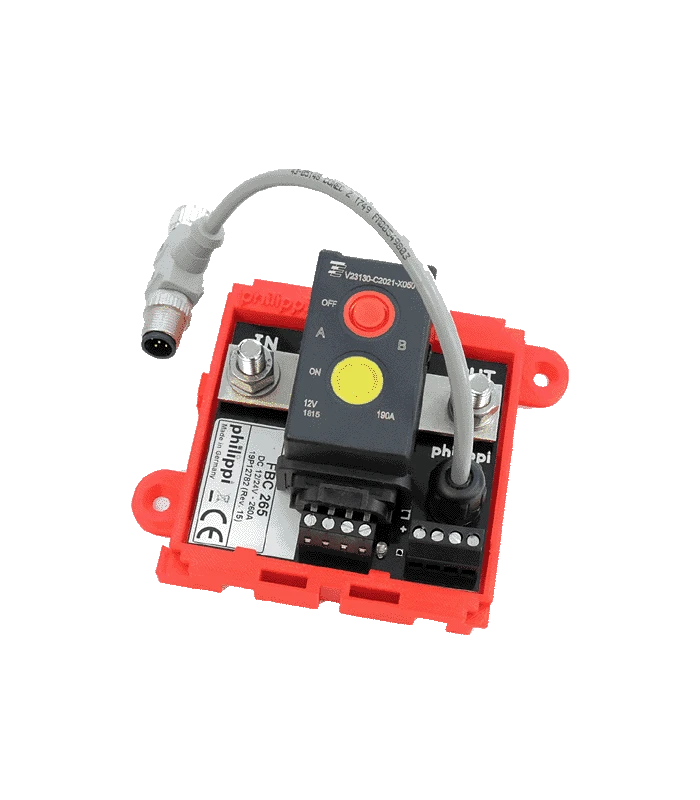 Zum bequemen Schalten der Batterie-Hauptschalter oder der Stromver- sorgung von Hochstromverbrauchern wie Winden, Ankerwinde, Wechselrichter (Energiemanagement) wird der fernsteuerbare BatterieHauptschalter FBC 265 eingesetzt. Der einstellbare Unter- und Über- spannungsschutz schützt gleichzeitig die Batterie vor Tiefentladung. Ist die Dauer-Strombelastung größer 260 A (z. B. Bugstrahlruder), kann durch Kombination des Interface TSC mit dem FBR 500 die Strombelastbarkeit auf 500 A erhöht werden. Zur unabhängigen Bedienung des Hauptschalters vom P-BUS empfehlen wir die Installation eines Steuertasters auch zur Notbetätigung. Der Batterie-Hauptschalter kann direkt am Relais über die roten und gelben Knöpfe handbetätigt werden.