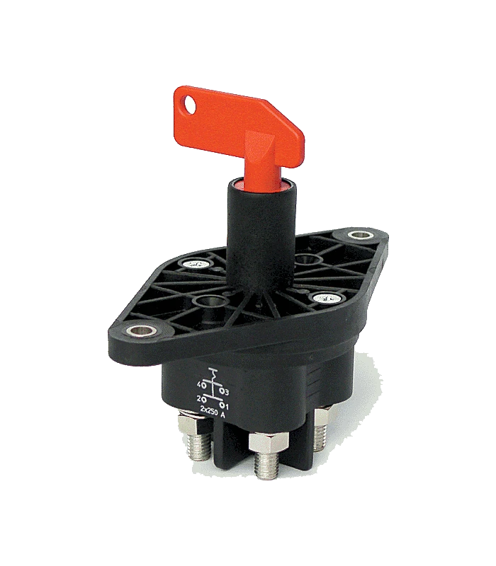 Batteriehauptschalter für hohe Strombelastung und dauerhafte Beanspruchung. Hochwertige professionelle Ausführung basierend auf den Erfahrungen aus der Relaistechnik in wasserdichter Ausführung. Schalthebel in Aus-Stellung abziehbar.