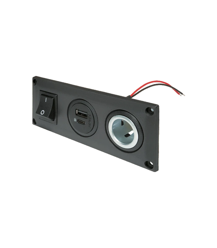1 USB-C/A Doppelsteckdose mit blauer LED, 12-24 V DC, Ausgang 5 V DC mit integriertem Spannungswandler, max. 3,6 A.