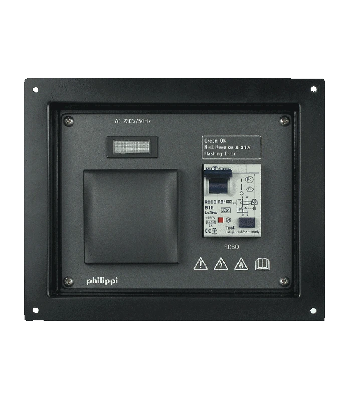 Landanschlusseinheit für Netzstromübernahme 230 V/50 Hz mit Schuko-Steckdose für die 230 V – Bordversorgung. Die Netzkontrollleuchten zeigen den korrekten Netzanschluss. Der Anschluss erfolgt auf der Rückseite über Durchführungsklemmen.