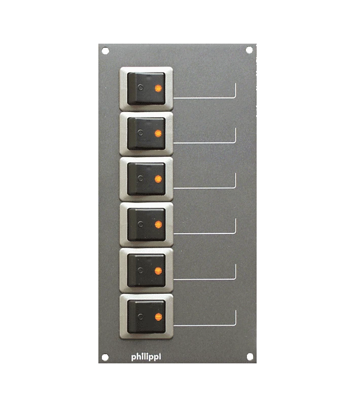 6 Stromkreise mit zweipoligen thermischen Wipp-Schutzschaltern 10 A für AC 230 V / 50 Hz.