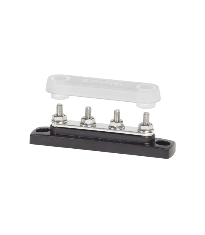 Hochwertige Sammelschiene aus verzinntem Kupfer, mit 4 Gewindebolzen Ø 4,8 mm.