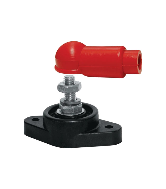 Sammelstützpunkt mit Gewindebolzen Ø 1/4“ (6,3 mm), L 19 mm. Gewindebolzen aus rostfreiem Stahl, Schutzkappe aus Weich-PVC im Lieferumfang. Spannungsbereich max. 48 V DC.