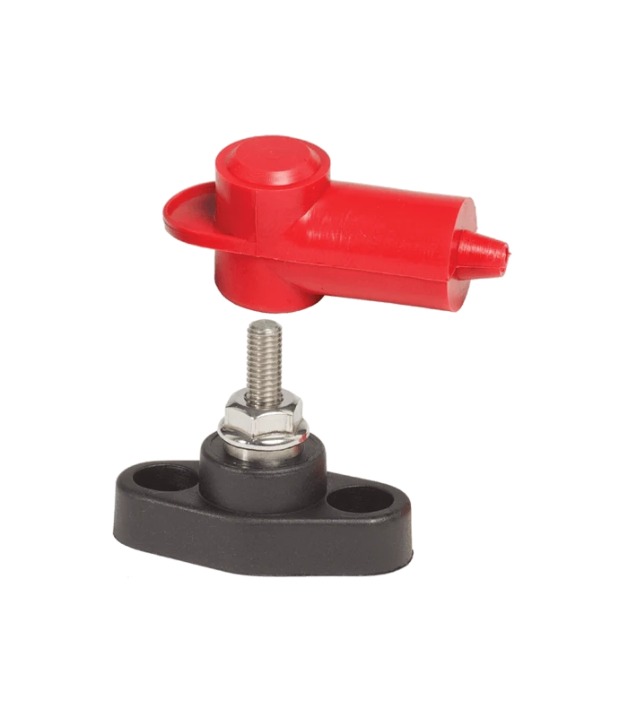 Sammelstützpunkt mit Gewindebolzen Ø ¼“ (6,3 mm), L 19 mm.Gewindebolzen aus rostfreiem Stahl, Schutzkappe aus Weich-PVC im Lieferumfang.Spannungsbereich max. 48 V DC.