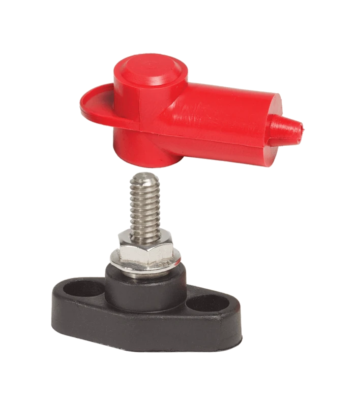 Sammelstützpunkt mit Gewindebolzen Ø ¼“ (6,3 mm), L 19 mm.Gewindebolzen aus rostfreiem Stahl, Schutzkappe aus Weich-PVC im Lieferumfang.Spannungsbereich max. 48 V DC.