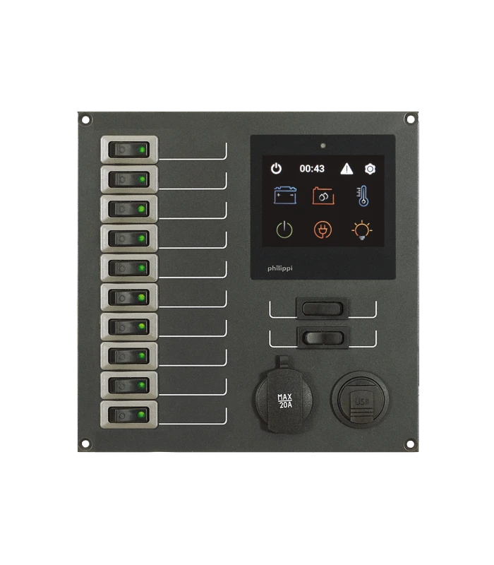 Stromkreisverteiler mit 10 Stromkreisen mit thermischen Wipp-Schutzschaltern, Nennstromstärke 10 A.