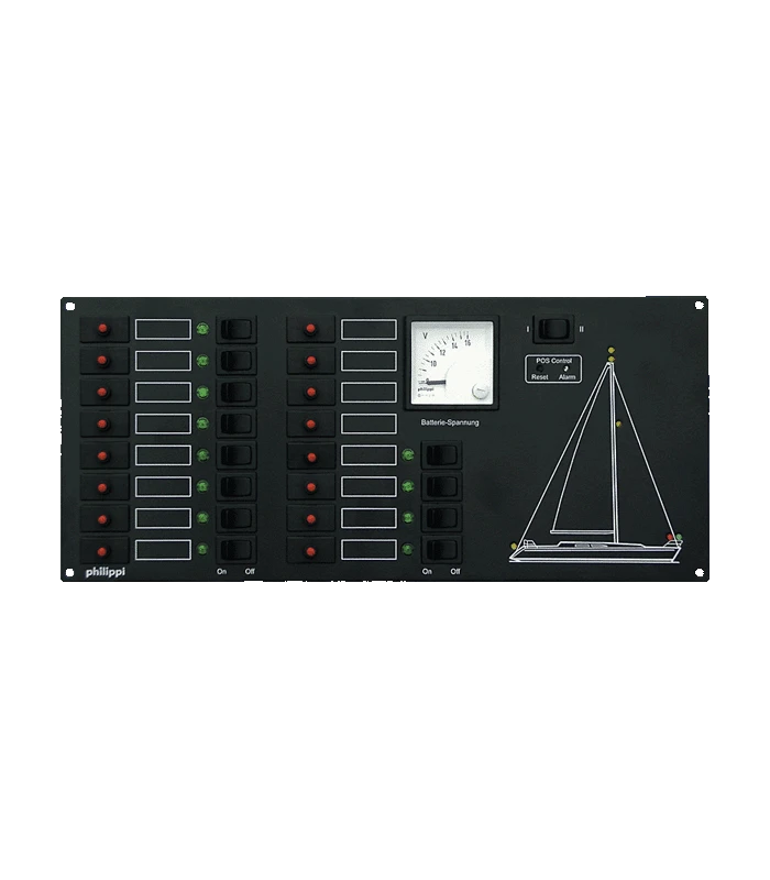 Kombinierter Stromkreisverteiler mit 12 Stromkreisen mit thermischen Sicherungsautomaten der Baureihe E-T-A 1140, Leuchtdiodenanzeige und Wippschaltern, Nennstromstärke 8 A. Zusätzlich 4 Sicherungsautomaten zur Absicherung von Verbrauchern, die nicht geschaltet werden.