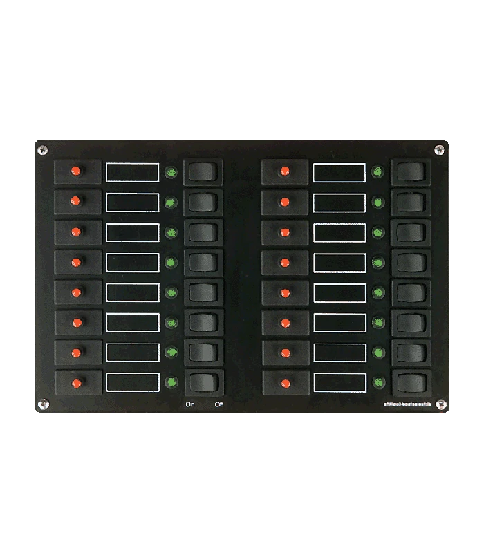 Stromkreisverteiler mit 16 Stromkreisen mit thermischen Sicherungsautomaten der Baureihe E-T-A 1140, Leuchtdiodenanzeige und Wippschaltern, Nennstromstärke 8 A.