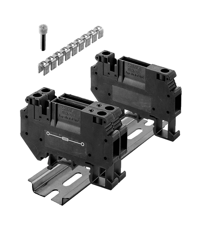 Eingangsseitig brückbare Sicherungklemme für Schutzschalter der Serie 1610. Für Hutschienenmontage, Anschluss über Schraubklemmen. Kabelquerschnitt max. 6 mm².