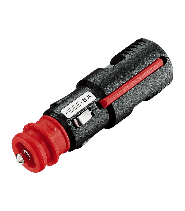 Universalstecker mit integrierter Sicherung 8 A mit Schraubanschluss, und Zugentlastung. Passend für Zigarettenanzünder und Normsteck-dosen. 6-24 V.