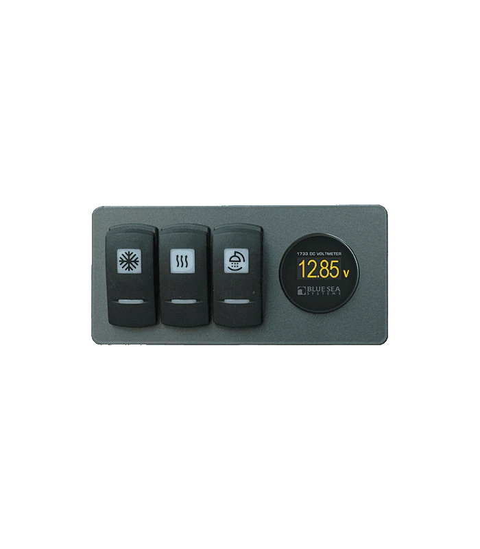 Stromkreisverteiler mit 3 Stromkreisen und DC-Voltmeter MVD mit thermischen Wipp-Schutzschaltern für den Aussenbereich, Nennstromstärke 10 A.