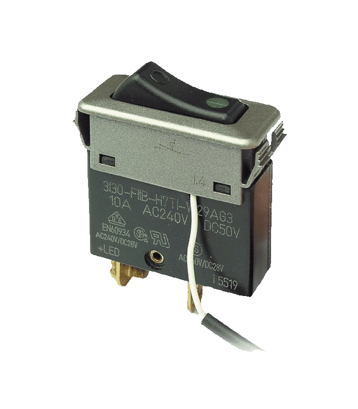 Einpoliger DC Ein-Aus-Wippenschalter mit Überstromschutzfunktion und grüner LED-Funktionsanzeige. Wippe schwarz, Rahmen silber. Schnapprahmenmontage, Befestigungsausschnitt 14,8 x 34,2 mm, Gerätebreite 18 mm.