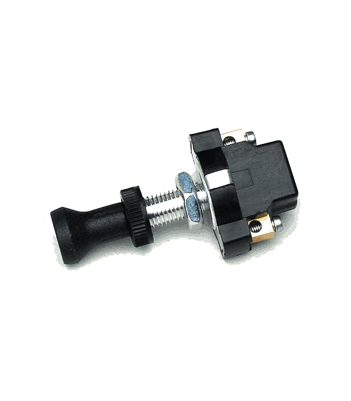 Zugschalter mit langem Gewindeschaft, Abmessungen 58 x Ø 14 mm (Knopf), Montageloch Ø 8 mm. Max. Wandstärke14 mm. Strombelastbarkeit 15 A.