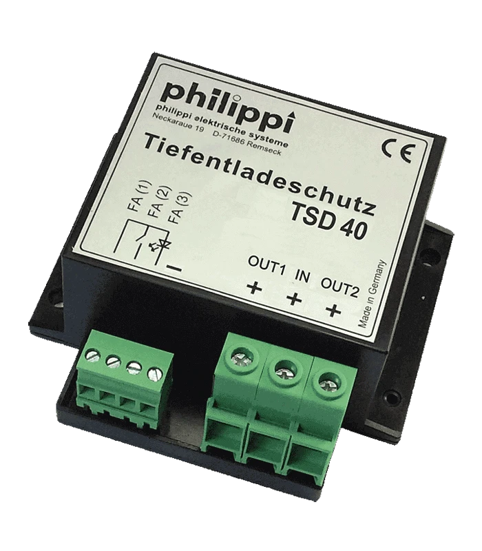 Der fernsteuerbare Tiefentladeschutz TSD 40 schützt die Batterie(n) vor Schädigung durch Tiefentladung. Herkömmliche Geräte schalten dazu auf einen Schlag angeschlossene Verbraucher ab. Mit dem zweistufigen Tiefentladeschutz können Sie wichtige bzw. sicherheitsrelevante Verbraucher weiterbetreiben, während Luxus-Verbraucher bei sinkender Batteriespannung in einem ersten Schritt abgeschaltet werden. Vor der drohenden Abschaltung warnt ein akustischer Alarm. Die Wiedereinschaltung erfolgt automatisch bei 12,5/25V. Mit der Einstellung „13 V“ kann ein Energiemanagement realisiert werden, z.B. kann eine zusätzliche Kühlbox, ein Heizteppich oder ein Warmwasserboiler aktiviert werden, sobald die Lichtmaschine läuft oder ein Solarpanel genug Energie erzeugt. Mit dem Fernbedienpanel FB-TSA können die beiden Ausgänge ferngeschaltet und im Notfall für eine kurze Zeitspanne wieder eingeschaltet werden.